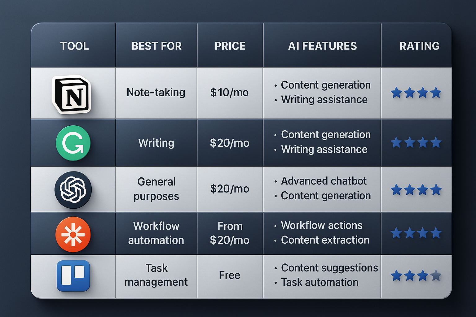 Notion AI Teams, Startups $10–15/month Content + Workflow ⭐⭐⭐⭐⭐